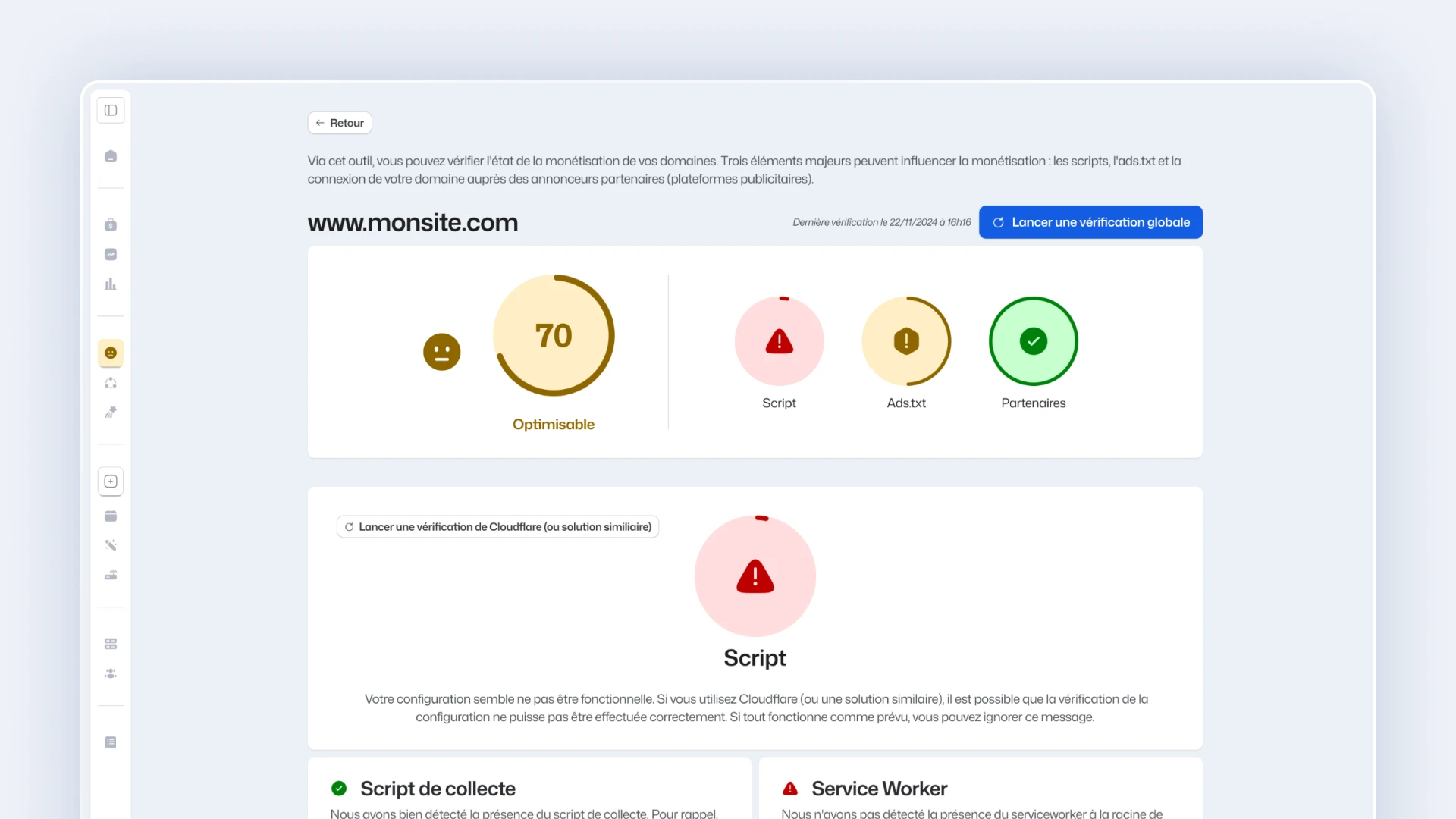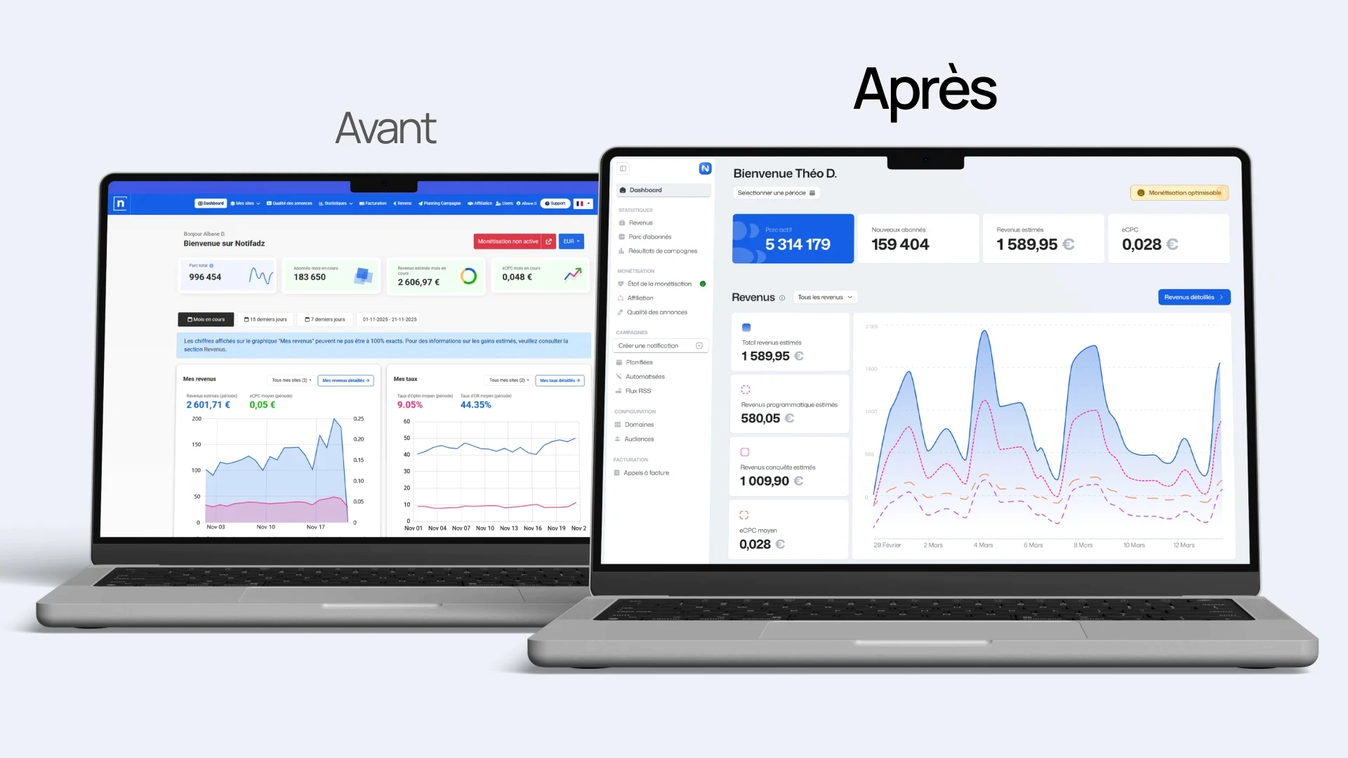 Notifadz est une plateforme SaaS utilisée par les équipes marketing pour gérer leurs campagnes de notifications web. Avec le temps, l’interface était devenue dense, hétérogène et complexe à faire évoluer. Le défi était de moderniser l’expérience tout en rendant les parcours plus clairs et plus intuitifs.